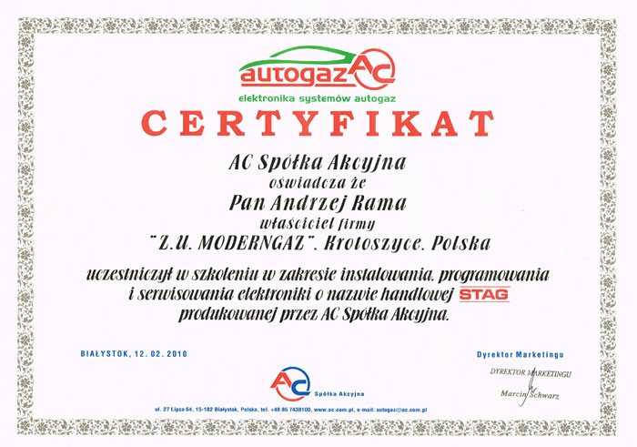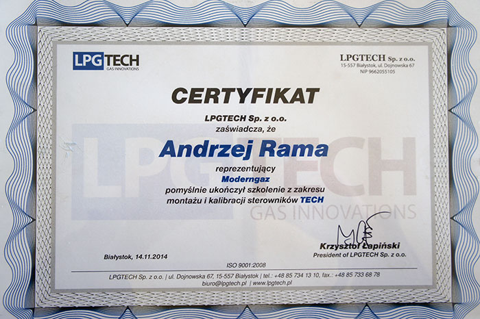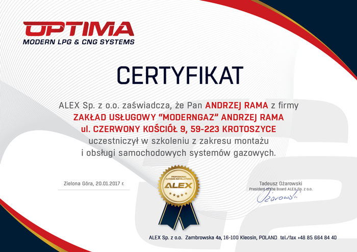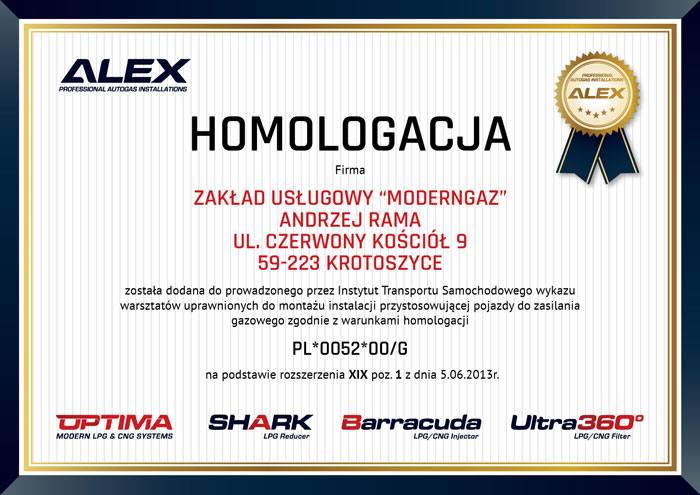 Certyfikat homologacji ALEX Zakładu Usługowego "MODERNGAZ".